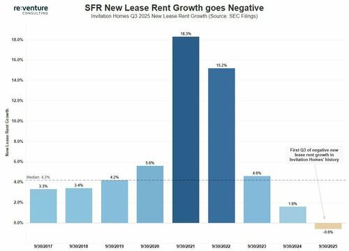 独栋住宅租金同步走弱:美国最大的上市独栋住宅房东Invitation Homes报告称,其2025年第三季度的新签租约租金增长为负,这是该公司自2017年上市以来首次在第三季度出现负增长。