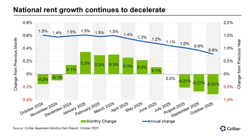 在美国劳工统计局(BLS)的官方消费者价格指数(CPI)报告可能因政府停摆而推迟发布的背景下,投资者正密切关注各类替代数据。其中,最引人注目的是来自房地产数据公司CoStar的报告,该报告显示10月份租金环比下降0.31%,为过去十五年来的最大跌幅。