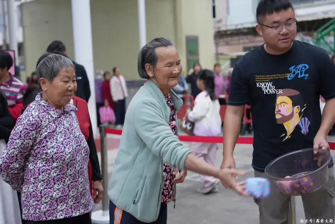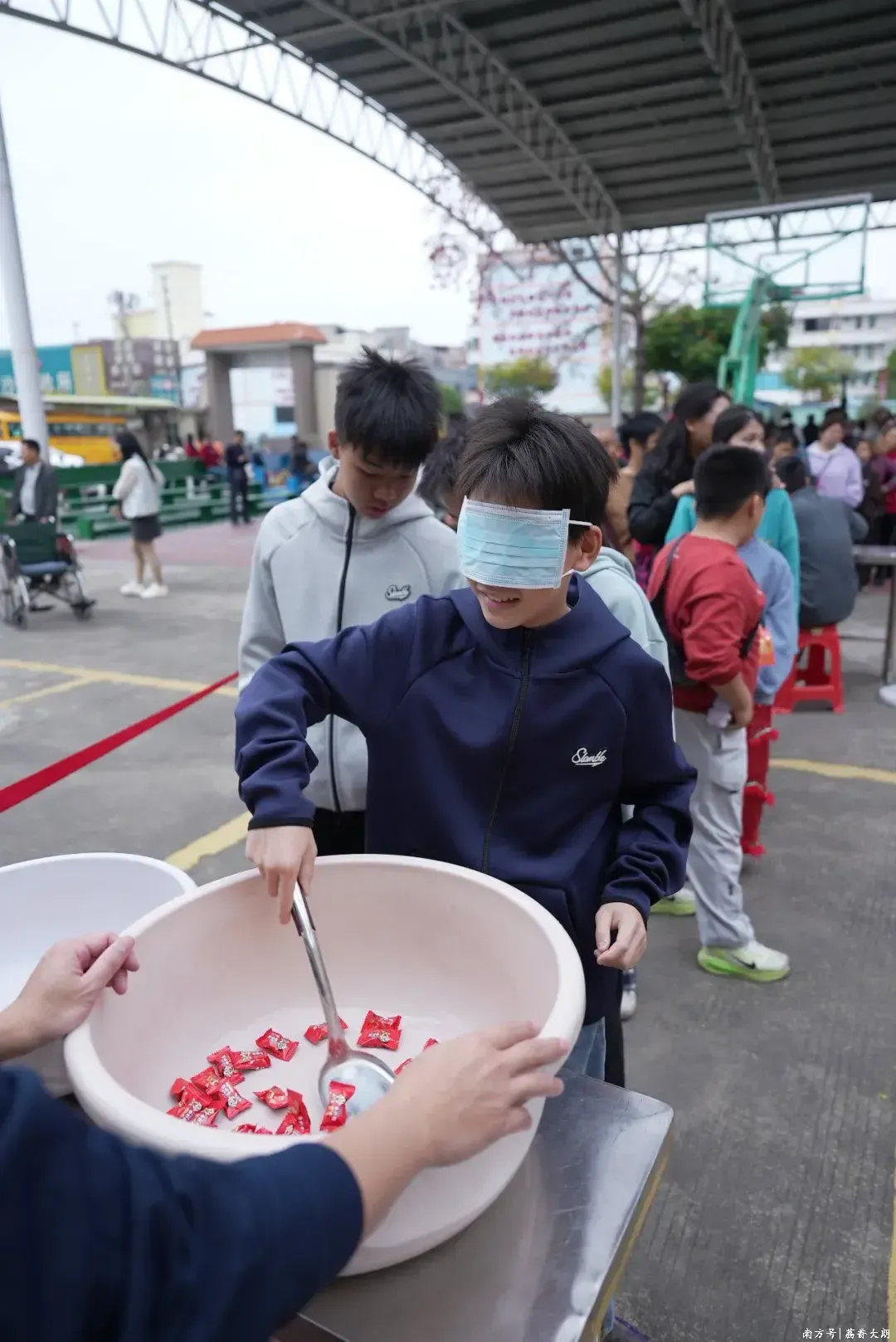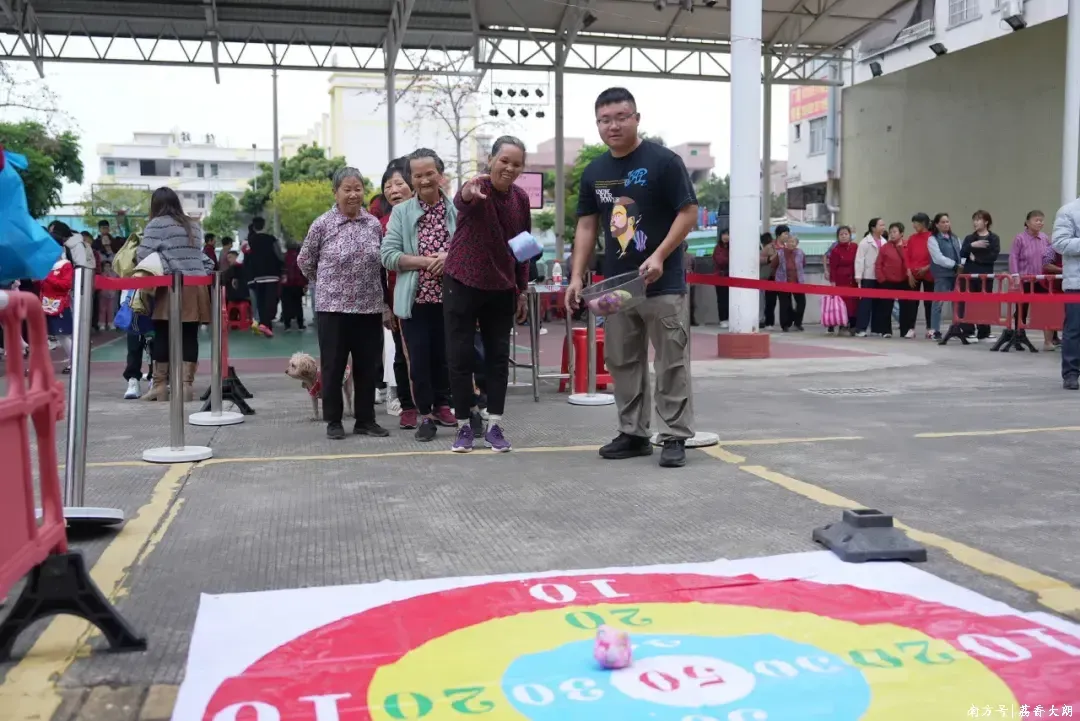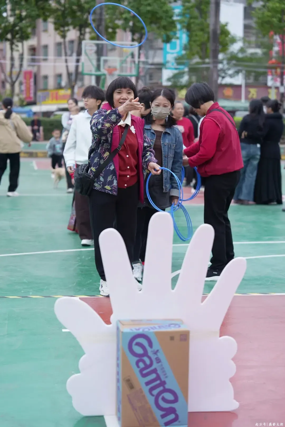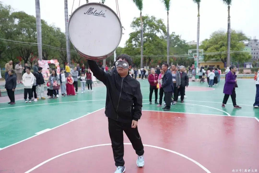 今天上午,石厦村的篮球场热闹非凡,蒙眼敲锣、套圈等趣味游园项目依次摆开,吸引了村民们踊跃参与。